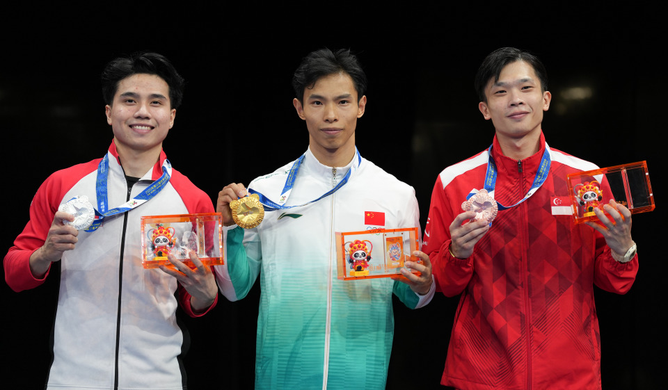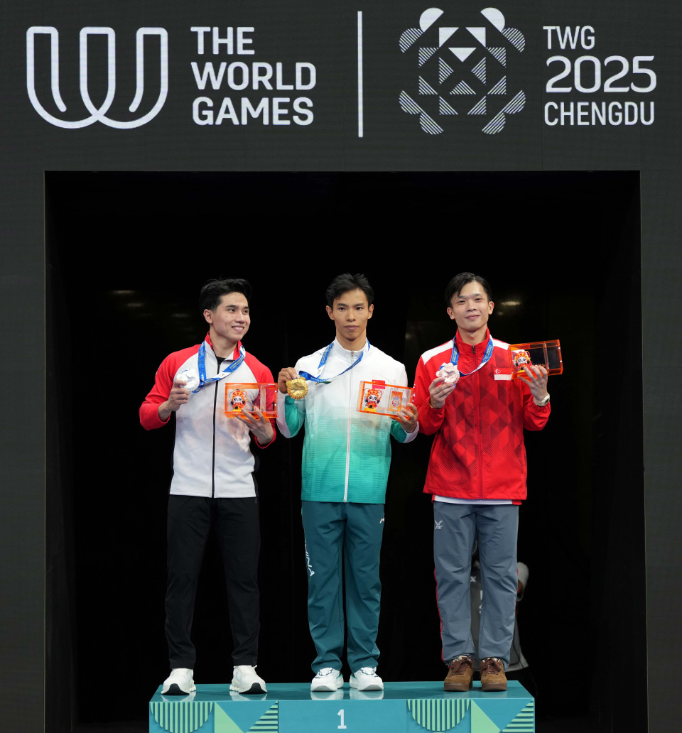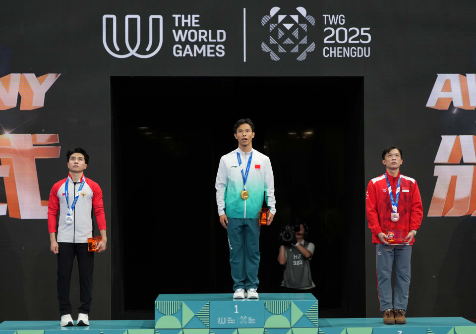 8月9日,冠军中国选手高久尚(中)、亚军印度尼西亚选手西雷加尔(左)和季军新加坡选手林思韦在颁奖仪式上。新华社记者 徐速绘 摄